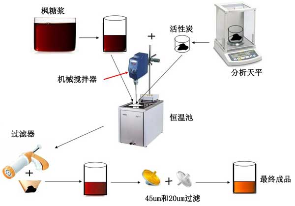 ¡¡¡¡¸ù¾ÝʵÑé²âÊÔ»îÐÔ̿ʹºÚ·ãÌǽ¬±äÉ«µÄ»úÖÆ£¬Ê¹ÓÃʳƷ¼¶»îÐÔÌ¿×÷ΪÎü¸½²ÄÁÏ£¬ÒÔ¸ÄÉÆÉîÉ«·ãÌǽ¬µÄÑÕÉ«ºÍÆøÎ¶/ζµÀ£¬´Ó¶øÉú²úÓëµÌǽ¬»òçúçêÉ«Ìǽ¬¡£Í¼1˵Ã÷Á˸òâÊÔÖÐʹÓõıäÉ«¹ý³Ì¡£ÎªÁ˽øÐÐʵÑ飬ÎÒÃÇʹÓÃÁ˲»Í¬Á¿µÄ»îÐÔÌ¿(0.01¡¢0.03ºÍ0.05 g)£¬²¢ÒýÈë10 mL·ãÌǽ¬ÑùÆ·ÖУ¬ÒԵõ½0.1¡¢0.3ºÍ0.5g/100 mLµÄ×îÖÕŨ¶È¡£È»ºó£¬½«»ìºÏÎï·ÅÈëºãγØÖУ¬ÒÔ±ãͨ¹ýʹÓõ綯½Á°è×°ÖÃÀ´µ÷½Ú¹¤×÷ζȺͽÁ°èËÙ¶È¡£½Á°è(»ìºÏ)ʱ¼äÉèÖÃΪ20¡¢40ºÍ60·ÖÖÓ¡£ÔÚ»ìºÏʱ¼ä½áÊøÊ±£¬Ê×ÏÈͨ¹ýʹÓüòµ¥µÄÖ½¹ýÂËÆ÷¹ýÂË»ìºÏÎÒÔÈ¥³ýʹÓùýµÄ»îÐÔÌ¿µÄ´ó¿ÅÁ£¡£Í¨¹ýʹÓÃÁ½¸ö·Ö±ð¾ßÓÐ45ºÍ20μmµÄɸ¿×³ß´çµÄ×¢ÉäÆ÷¹ýÂËÆ÷½øÐеڶþ´Î¹ýÂË¡£