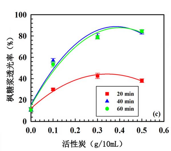 ¡¡¡¡·ãÌǽ¬Í¸¹âÂÊËæ»ìºÏʱ¼äºÍÌí¼ÓµÄ»îÐÔ̿Ũ¶ÈµÄ±ä»¯¡£·ãÌǽ¬µÄ͸¹âÂÊËæ»îÐÔÌ¿»ìºÏʱ¼ä(20¡¢40ºÍ60·ÖÖÓ)µÄ±ä»¯(»îÐÔÌ¿ÀàÐͲ»Í¬)¶ø±ä»¯Èçͼ3Ëùʾ¡£»ñµÃµÄ½á¹û±íÃ÷£¬»îÐÔ̿ͨ¹ýʹÓÃ40·ÖÖӵĴ¦Àíʱ¼ä£¬Îü¸½¶¯Á¦Ñ§´ïµ½ÁË×î´óÖµ¡£ÔÚÕâÖÖÇé¿öÏ£¬»ñµÃµÄ×î´ó͸¹âÂÊΪ83.70±0.21%¡£´Ëºó£¬Îü¸½´ïµ½±¥ºÍ¡£µ«ÊÇ£¬Ôڹ̶¨Ê¹ÓÃŨ¶ÈµÄ»îÐÔ̿ϣ¬»ìºÏʱ¼äµÄÓ°ÏìÔÚ20·ÖÖӵĴ¦ÀíÖÐ×îµÍ¡£»ìºÏ40ÖÁ60·ÖÖÓÖ®¼äδ¹Û²ìµ½Ã÷ÏÔ²îÒì¡£