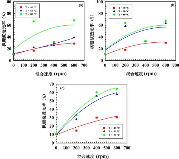 ¡¡¡¡Í¼4£ºÔڹ̶¨¹¤×÷ζȺͻîÐÔÌ¿Á£¾¶Ï£¬Í¸¹âÂÊÓë»ìºÏËٶȵĹØÏµ£º(a)25μm£¬(b)50μm£¬(c)75μm¡£