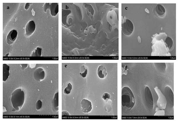 图2:在0(a),2(b),4(c),6(d),8(e),10(f)循环数后经过再生处理的活性炭的SEM图像。