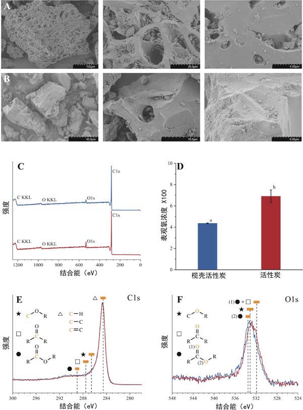 ¡¡¡¡Í¼1£º(A)é¿Ç»îÐÔÌ¿ºÍ(B)»îÐÔÌ¿ÔÚһϵÁзŴó±¶ÊýϵÄSEMÏÔ΢ÕÕÆ¬£¬(C)XPSµ÷²éɨÃ裬(D)±í¹ÛÑõÔªËØÅ¨¶È£¬(E)̼Ðźţ¬(F)ÑõŨ¶ÈÖ®¼äµÄÏÔ×ŲîÒì¡£