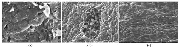 ¡¡¡¡Í¼1£ºSEM·ÖÎö£º(a)Ò»°ã»îÐÔÌ¿£¬(b)»î»¯»îÐÔÌ¿£¬ºÍ(c)Îü¸½ºóµÄ»îÐÔÌ¿¡£