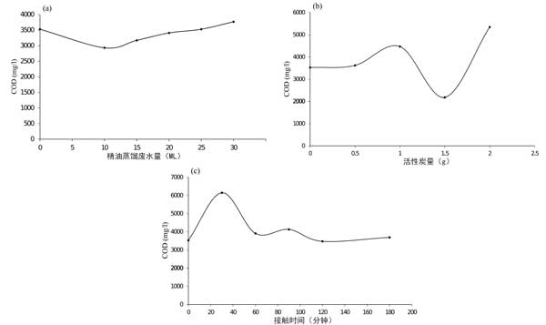 ¡¡¡¡µ±10ºÁÉý·ÏË®Á¿Ê±»îÐÔÌ¿Îü¸½ºó½µµÍµÄCODÖµÔÚͼ2ÏÔʾ¡£ÔÚ10ml·ÏÒºÁ¿Ï»ñµÃÁ¼ºÃÎü¸½£¬ÆäCODֵΪ3000×óÓÒ¡£¶¡Ïã·ÏÓ͵ÄCODÖµ±íÃ÷Á˽Ӵ¥Ê±¼ä¶ÔÎü¸½¹ý³ÌµÄÓ°Ïì¡£ÔÚ30·ÖÖӵĽӴ¥Ê±¼äÄÚ£¬CODÖµÔö¼Ó¡£½Ó´¥30·ÖÖÓºó£¬CODˮƽÔÚºÏÊÊÌõ¼þÏÂ120·ÖÖÓÏà¶ÔÎȶ¨¡£