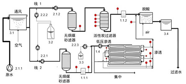 ¡¡¡¡°ë¼¼ÊõÊÔÑ鹤³§°²×°ÁËµçÆø°²×°£¬¹¤³§¿ØÖƺÍÊý¾Ý¹ÜÀí¡£ÖÐÊÔ¹¤³§ÓÉÁ½Ìõ´¦ÀíÏß»îÐÔÌ¿ºÍ·´ÉøÍ¸Ä¤(²Î¼ûͼ1)×é³É£¬¾ßÓÐ17¸ö²ÉÑùµã¡£³äÆøºóµÄÔˮͨ¹ýÔöѹ±Ã2.1.1ºÍ2.1.2´Ó´¢Ë®Ïä(3.1)Á¬Ðø±Ã³ö¡£½«ºÛÁ¿ÓлúÎÛȾÎï(3.2)×¢Èë±êÓÐ2.2.1ºÍ2.2.2µÄ±ÃµÄÎüÈë²à£¬ÒÔÈ·±£Êʵ±µÄ³åÏ´»ìºÏºÍÁ¼ºÃµÄ·ÖÉ¢ÐÔ¡£¼ÓË®ºóµÄË®ÒÔÆ½ÐÐģʽͨ¹ýÎÞÑÌúɰÂ˳ØÒÔ¼°ËæºóµÄ»îÐÔÌ¿(Ïß1)ºÍ·´ÉøÍ¸Ä¤(Ïß2)¡£Ã¿Ô¶ÔÁ£×Ó¹ýÂËÆ÷½øÐз´³åÏ´¡£ÎªÁ˲âÊÔ×ÏÍâÏßÏû¶¾ÔÚ·´ÉøÍ¸Ä¤Ö®Ç°×÷Ϊ¼õÉÙÉúÎï½á¹¸µÄ¸½¼ÓÔ¤´¦Àí²½ÖèµÄЧ¹û£¬ÔÚ»îÐÔ̿ɰÂ˳صÄÏÂÓβÙ×÷ÁË×ÏÍâÏß×°ÖÃ(1.1.1)¡£·´ÉøÍ¸Ä¤¹ÜÏߵĽøÁÏͨ¹ýÁ½¸öÂËͲ¹ýÂËÆ÷½øÐÐÔ¤´¦Àí£¬Á½¸öÂËͲ¹ýÂËÆ÷ÒÀ´Î°²×°ÁË80ºÍ5μmµÄ±ê³Æ½ØÖ¹Öµ¡£