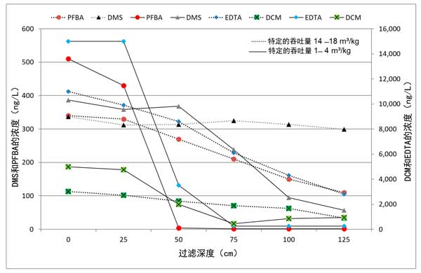 ¡¡¡¡Í¼2£º»îÐÔÌ¿¹ýÂËÆ÷ÖкÛÁ¿ÓлúÎÛȾÎïµÄÉî¶ÈÒÀÀµÅ¨¶ÈÇúÏß¡£