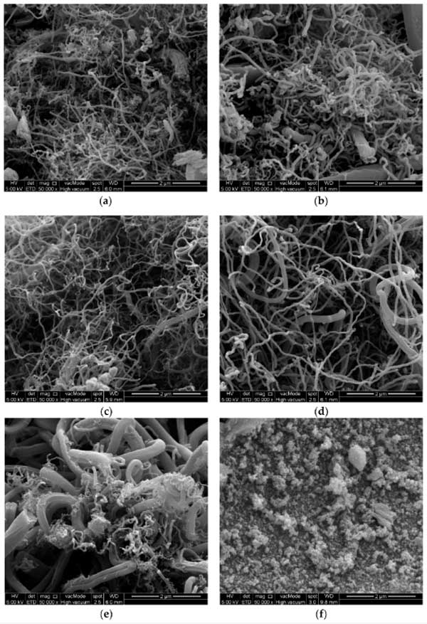 ¡¡¡¡ÓÃFESEM¼¼Êõ·ÖÎöÁ˺ϳÉÑùÆ·µÄÐÎÌ¬ÌØÕ÷¡£Í¼2a-fÏÔʾÁË·Å´óµÄ50,000±¶µÄÁù¸öÑ¡¶¨»îÐÔÌ¿ÑùƷͼÏñ¡£Í¼2cÏÔʾÁË»îÐÔÌ¿5µÄFESMͼÏñ£¬Í¨¹ýʹÓÃ5%µÄÌú×÷Ϊµ¥´ß»¯¼ÁºÍ40·ÖÖӵķ´Ó¦Ê±¼ä£¬·¢ÏÖÌ¿²úÂʺͽӴ¥½Ç½Ï¸ß¡£ÔÚ´ËÑù±¾Öз¢ÏÖÁËÁ½ÖÖÀàÐ͵Ä̼ÄÉÃײÄÁÏ£¬·Ö±ðÊÇ̼ÄÉÃ×ÏËάºÍ¶à±Ú̼ÄÉÃ׹ܡ£Í¼2fÏÔʾÁË»îÐÔÌ¿3µÄFESEMͼÏñ£¬¸ÃͼÏñÊÇͨ¹ýʹÓÃ4%µÄîÜ×÷Ϊµ¥´ß»¯¼ÁºÍ40·ÖÖӵķ´Ó¦Ê±¼äÖÆ±¸µÄ¡£·¢ÏÖ½öʹÓôóÁ¿µÄîÜ×÷Ϊ´ß»¯¼Á²úÉú·Ç³£²îµÄÌ¿²úÂÊ£¬Õâ±íÃ÷²ÄÁÏÖÆ±¸µÃ²»ÔõôºÃ¡£Í¼2eÏÔʾÁË»îÐÔÌ¿4µÄFESEMͼÏñ£¬¸ÃͼÏñÊÇͨ¹ýʹÓÃ5%µÄÌúºÍ4%µÄîÜ×÷Ϊ˫½ðÊô´ß»¯¼ÁÖÆ±¸µÄ£¬·´Ó¦Ê±¼äΪ40·ÖÖÓ¡£¸ÃͼÏñ±íÃ÷£¬Ê¹ÓôóÁ¿µÄîܺÍÌúʱ£¬Ö÷ÒªÉú³É¾Û¼¯µÄÌ¿ÄÉÃײÄÁϺÍ̼ÄÉÃ×ÏËά£¬ÒòΪÕâÑùµÄʵÑéÌõ¼þ²»ÊÇÓÅÑ¡µÄ¡£