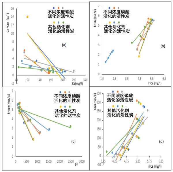 ¡¡¡¡Í¼3£º¸ù¾ÝLangmuir(a)£¬Freundlich£¬(b)Ìõ¼þD-R-K£¬(c)ºÍTemkin£¬(D)±½¶þ°·ÔÚ»îÐÔÌ¿ÉϵÄÎü¸½µÈÎÂÏß¡£