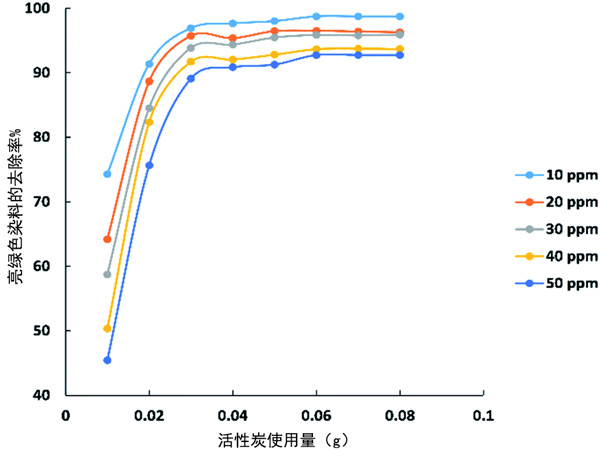 ¡¡¡¡Í¼3£º»îÐÔ̿ʹÓÃÁ¿¶ÔÁÁÂÌɫȾÁÏÎü¸½ÔÚ»îÐÔÌ¿ÉϵÄÓ°Ïì¡£