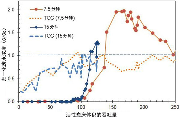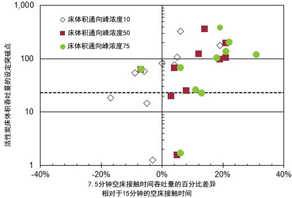 ¡¡¡¡¿Õ´²½Ó´¥Ê±¼ä¶ÔÍ»ÆÆµÄÓ°Ïì˵Ã÷ÈçÏ£ºÍ¼2ÓÃÓÚ123-ÈýÂȱûÍé¡£¾¡¹Ü7.5·ÖÖÓºÍ15·ÖÖÓEBCTµÄ123-ÈýÂȱûÍéÍ»ÆÆµÄ¿ªÊ¼ÊÇÏàËÆµÄ£¬µ«ÔÚ100,000´²Ìå»ýÖ®ºó£¬Óë7.5·ÖÖÓEBCTÏà±È£¬15·ÖÖÓEBCTµÄÍ»ÆÆ¸üÔç¡£¸ü³¤µÄEBCTÈÝÁ¿½µµÍ¿ÉÄÜÊÇ»îÐÔÌ¿½á¹¸µÄ½á¹û£¬ÕâÊÇÓÉÓÚ¸üÇ¿µÄÎü¸½Á¦ºÍ²»¿ÉÖû»µÄDOMµ½´ïÎü¸½´²µÄ¸üÉî´¦£¬²¢³¬¹ýÁËÄ¿±êÓлúÎïµÄÎü¸½Î»µãºÍ/»ò¸²¸ÇÁË»îÐÔÌ¿¿ÅÁ£µÄ¿×¶øµ¼Öµġ£Ê±¼ä²¢·ÀÖ¹½øÒ»²½µÄÄ¿±êÓлúÎïÎü¸½¡£Í¨¹ý±È½ÏÏàËÆÍ»ÆÆµãµÄÍÌÍÂÄÜÁ¦²îÒ죬˵Ã÷ÁËEBCT¶ÔÆäËûcVOCµÄ»îÐÔÌ¿ÐÔÄܵÄÓ°Ï죬ÆäÖиºÖµ±íʾÔÚ15·ÖÖÓEBCTʱÈÝÁ¿¸ü´ó£¬ÕýÖµ±íʾÔÚ7.5·ÖÖÓEBCTʱÈÝÁ¿¸ü´ó(»òÔÚ15·ÖÖÓEBCTʱÈÝÁ¿½ÏС)¡£´²Ìå»ýÊýÁ¿´ïµ½Í»ÆÆµÄ10%£¬50%»ò75%µÄƽ¾ùÈÝÁ¿²îÒì(²»°üÀ¨VC£¬ÒòΪδÆÀ¹À15·ÖÖÓEBCT)·Ö±ðΪ-0.1%£¬9%ºÍ13%£¬±íÃ÷ÔÚÔËÐÐʱÈÝÁ¿Ã»ÓÐËðʧ¡£15·ÖÖÓµÄEBCTÍ»ÆÆÁË10%£¬Í»ÆÆÁËÊʶȵÄÈÝÁ¿£¬ÒòΪ¸ü³¤µÄEBCT½á¹¸ÁË£¬Òò´ËÍ»ÆÆÁË50%ºÍ75%¡£