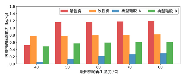 ¡¡¡¡»îÐÔÌ¿µÄ³ýʪÄÜÁ¦¿ÉÒÔ¶¨ÒåΪÔÚ¸ø¶¨Î¶ȺÍʪ¶ÈÌõ¼þϵÄÓÐЧÎü¸½Á¿£¬Æä¼ÆË㷽ʽΪÎü¸½Óë½âÎüÖ®¼äµÄƽºâÎü¸½Ö®²î¡£¿¼Âǵ½Êµ¼Ê»·¾³Ìõ¼þ£¬Ï൱ÓÚÊÒÍâ¿ÕÆøÌõ¼þµÄÎü¸½Ìõ¼þΪ¸ÉÇòζÈΪ32¡æ£¬Ïà¶Ôʪ¶ÈΪ80%¡£½âÎüÌõ¼þÊÇÓÉÔÙÉú¿ÕÆøÎ¶ȴÓ40¡æµ½80¡æ¸ø³öµÄ£¬ÊÒÍâ¿ÕÆøÌõ¼þϵÄʪ¶È±ÈΪ24g/kg¡£¼ÆËã³öµÄ³ýʪÄÜÁ¦Èçͼ1Ëùʾ¡£±È½ÏÁË»îÐÔÌ¿ºÍµäÐ͹轺(AÐͺÍBÐ͹轺)ÔÚ²»Í¬ÔÙÉúζÈϵijýʪÄÜÁ¦¡£Ôڹ轺µÄÇé¿öÏ£¬ÓÉÓÚȱ·¦Êý¾Ý£¬Îü¸½ºÍ½âÎüÖ®¼äµÄ´ÅÖͱ»ºöÂÔÁË£¬²¢ÇÒÔ¤ÆÚËüºÜС¡£