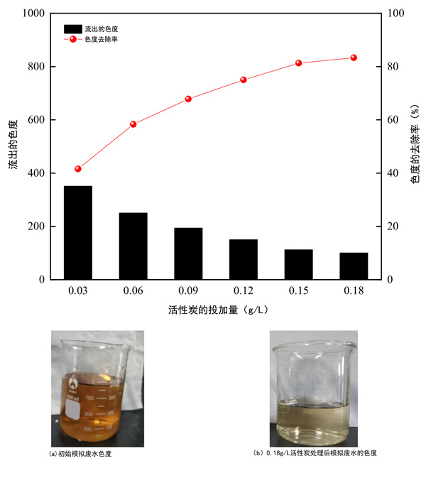 ¡¡¡¡Í¼3£º»îÐÔÌ¿ÓÃÁ¿¶ÔÄ£Äâ·ÏË®ÖÐÉ«¶ÈÈ¥³ýµÄÓ°Ï죬ģÄâ·ÏË®µÄÉ«¶È¡£