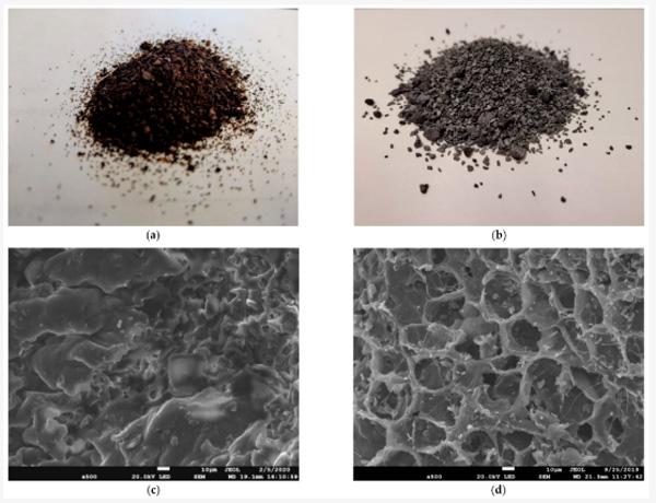 ¡¡¡¡Í¼1£º(a)´¦Àíºó»ñµÃµÄÔ²ÄÁϺÍ(b)»îÐÔÌ¿£¬ÒÔ¼°(c)Ô²ÄÁϺÍ(d)»îÐÔÌ¿ÔÚ500xϵÄSEMͼÏñ¡£
