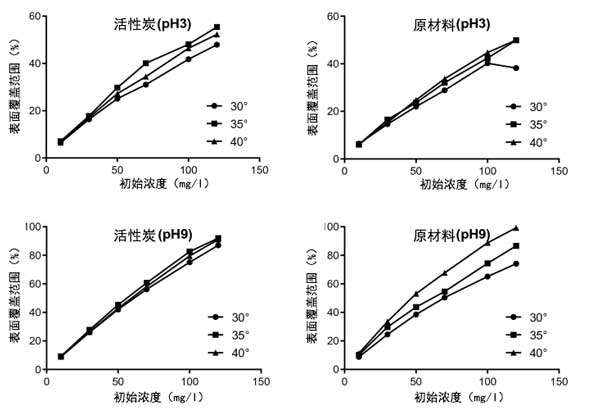 ¡¡¡¡ÔڽϸߵÄζȺÍpHÏ¿ɻñµÃ¸üºÃµÄ¸²¸ÇÂÊ¡£»îÐÔÌ¿µÄ±íÃæ¸²¸ÇÂʸßÓÚÔ²ÄÁÏ(ͼ2)¡£ÔÚÿ¸öʵÑé°¸ÀýÖУ¬ÔÚpH9ºÍ40°CÏ£¬ÔÁϵÄ×î´ó¸²¸ÇÂÊΪ99.3%;ÔÚpH9ºÍ35°CÏ£¬»îÐÔÌ¿µÄ×î´ó¸²¸ÇÂÊΪ92%;ÔÚpH3ºÍ35°CÏ£¬»îÐÔÌ¿µÄ×î´ó¸²¸ÇÂÊΪ55.4%;ÔÚpH3ºÍ40°CÏ£¬ÔÁϵĺ¬Á¿Îª50%¡£ÔڽϸߵÄĸō¶ÈºÍ½Ï¸ßµÄpHֵϿɻñµÃ½Ï¸ßµÄ±íÃæ¸²¸ÇÂÊ¡£±íÃæ¸²¸ÇÂÊÊÇÈÜÖʶԻîÐÔλµãÀûÓó̶ȵÄÁ¿¶È¡£Òò´Ë£¬½Ï¸ßµÄ±íÃæ¸²¸ÇÂʱíÃ÷¿ÉÓó¡ËùµÄÀûÓÃÂʸü¸ß¡£