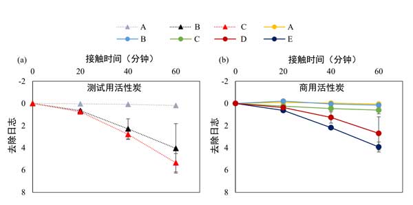 图2:在不同的接触时间(0、20、40和60分钟),测试用(a)和活性炭(b)去除MS2。
