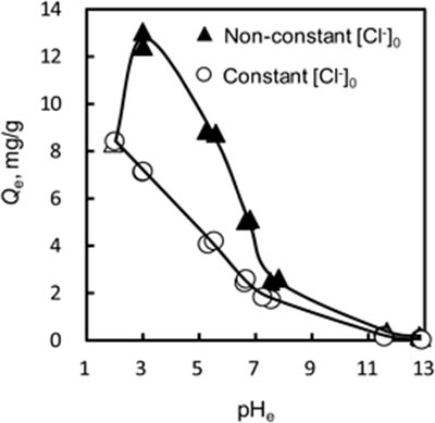 活性炭上的硝酸根离子吸附量与溶液的pH e之间的关系如图1所示。硝酸根离子在碱性条件下几乎不被吸附,这意味着氢氧根离子会抑制硝酸根离子的吸附。另一方面,随着平衡pH的降低,硝酸根离子的吸附量增加。在碱性条件下,由于硝酸根离子与活性炭表面之间的静电排斥,硝酸根离子很难被吸附在活性炭上。另一方面,硝酸根离子的吸附量在酸性条件下增加,这归因于硝酸根离子与碳表面之间的静电吸引力。然而,随着平衡pH从3.0降低到2.0,观察到硝酸根离子吸附的显着降低。在此pH范围内,氯离子的初始浓度从2 m增加到20 m M,这意味着共存的氯离子会抑制硝酸根离子的吸附。通过NaCl溶液将氯离子的初始浓度固定在20 m M时,可以清楚地发现氯离子对硝酸根离子的吸附抑制作用,表明硝酸根离子在所有pH区域的吸附量均低于没有任何pH调节的溶液。因此共存阴离子会导致竞争吸附影响硝酸根离子吸附的效果,并且这种作用可能是较强的在共存阴离子的浓度较高。